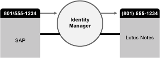 在下圖中,SAP HR 資料庫是使用者電話號碼的管理來源。因為 Lotus Notes 系統也使用電話號碼,所以 Identity Manager 會將號碼轉換成必要的格式,再分享給 Lotus Notes 系統使用。每當電話號碼在 SAP HR 系統中一有變動,就會同步至 Lotus Notes 系統。