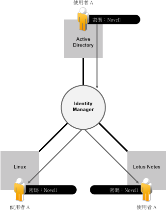 Identity Manager 功能之一的資料同步也可以協助您在系統之間同步密碼。例如,如果使用者在 Active Directory 中變更自己的密碼,Identity Manager 可以將這個密碼同步至 Lotus Notes 和 Linux。