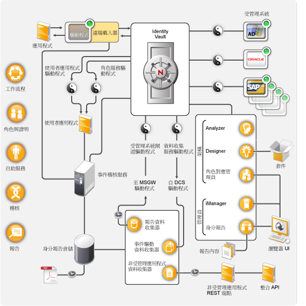 下圖顯示了高階架構元件,這些元件提供節 1.0, Identity Manager 與企業流程自動化 中介紹的 Novell Identity Manager 功能:資料同步、工作流程、角色、證明、自助服務及稽核/報告。