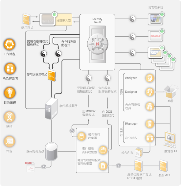 使用者應用程式驅動程式: 「使用者應用程式」驅動程式會儲存組態資訊,且只要 Identity Vault 中一有變動,就會通知「使用者應用程式」。也可以將它設為允許 Identity Vault 中的事件觸發工作流程,並向「使用者應用程式」回報工作流程的提供活動是成功或失敗,以便使用者檢視其申請的最終狀態。