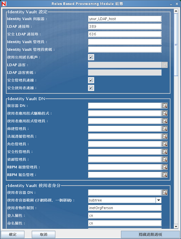 「Roles Based Provisioning Module 組態」面板的預設檢視窗會顯示下列六個欄位: