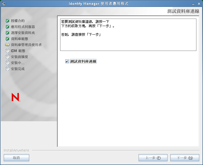 若要確認之前螢幕中提供的資訊是否正確,可以選取「」核取方塊來測試資料庫連接: