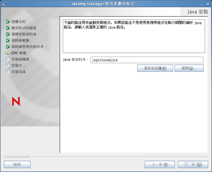 此時,安裝程式還會驗證選取的 Java 是否適用於所選的應用程式伺服器。另外,也會驗證其是否可以寫入指定 JRE 中的 cacerts。 |