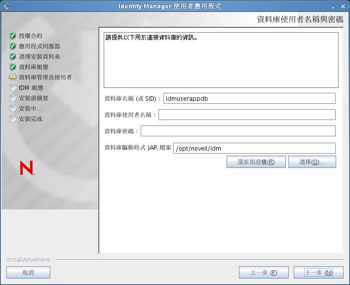 根據下列資訊選取安裝類型、選擇安裝資料夾,並設定資料庫: