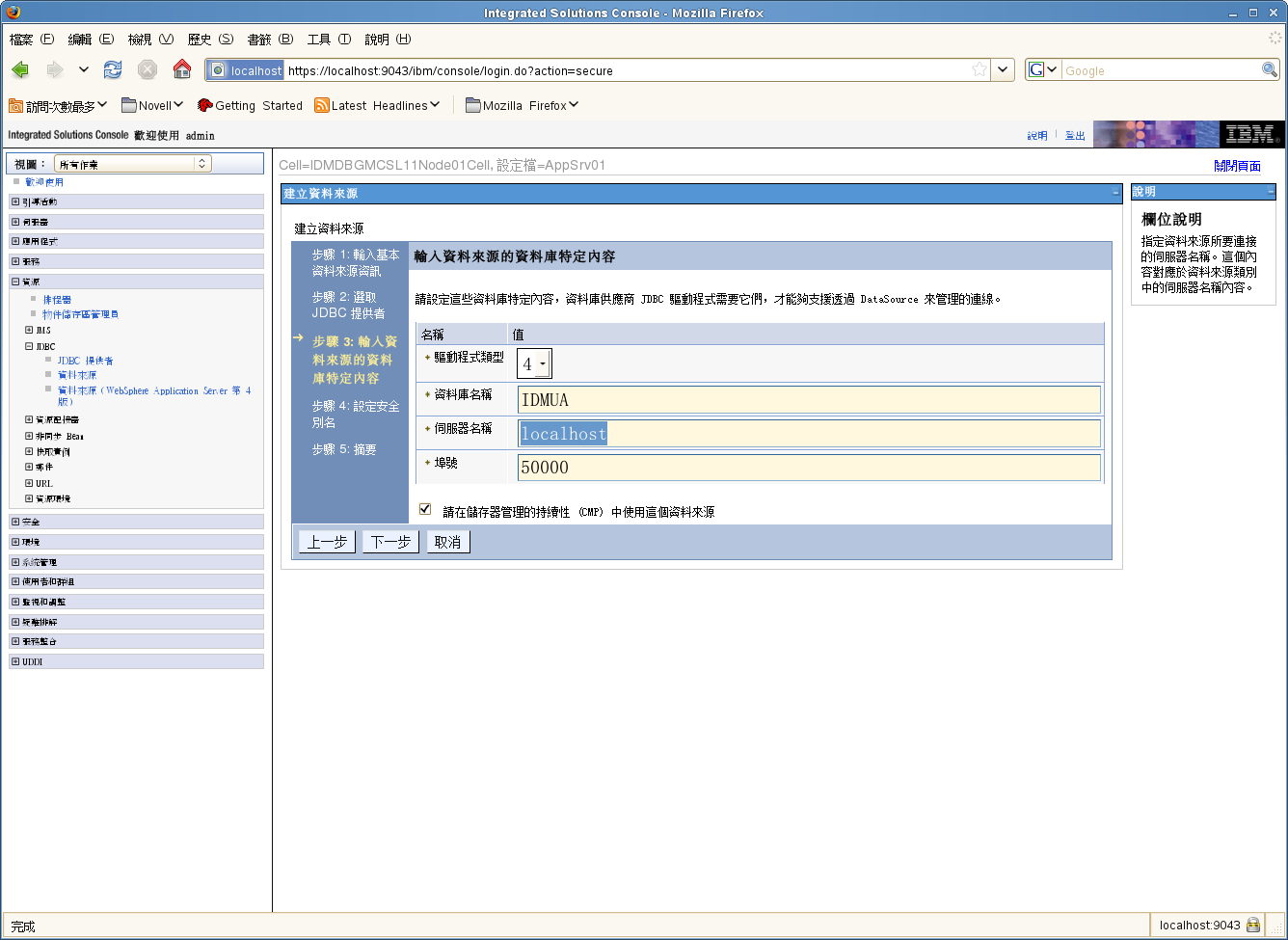 輸入資料來源名稱和 JNDI 名稱 (例如,對兩者均輸入 IDMUADataSource)。