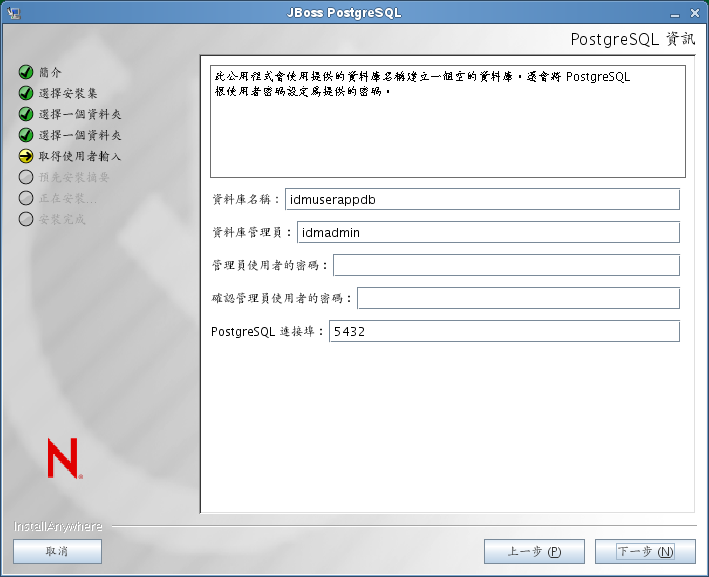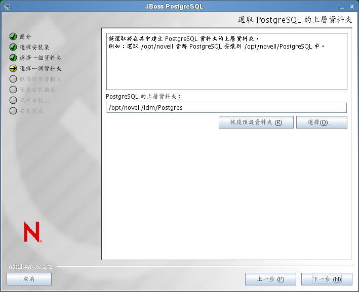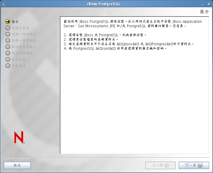 JBossPostgreSQL 公用程式會在您的系統上安裝 JBoss Application Server 和 PostgreSQL。這個公用程式不支援主控台模式,需要圖形使用者介面環境。