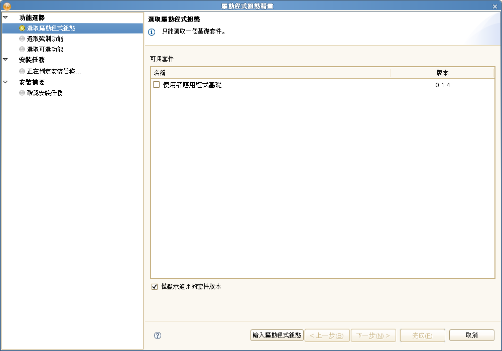 在嘗試設定驅動程式之前,您需要先確定套件目錄中存在所有必要的套件。在建立新的 Identity Manager 專案時,使用者介面會自動提示您將幾個套件輸入至新的專案中。若您在建立專案時選擇不輸入套件,則需要在以後予以安裝,如下所述。