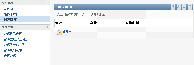 輸入搜尋準則或使用之前儲存的搜尋準則,便可以使用「目錄搜尋」頁面來搜尋使用者、群組或小組。