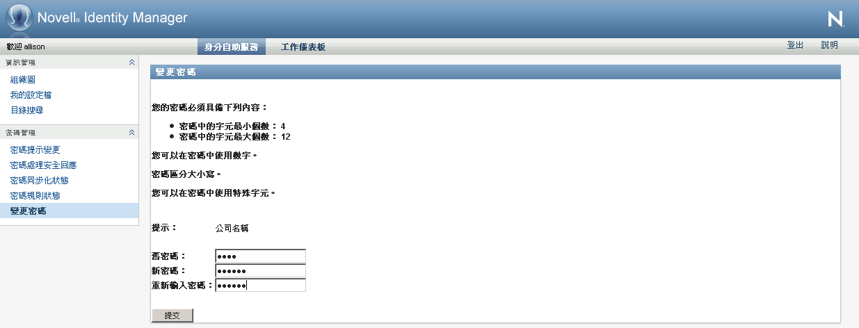 如果系統管理員允許,您可以在需要時隨時使用此頁面變更密碼。