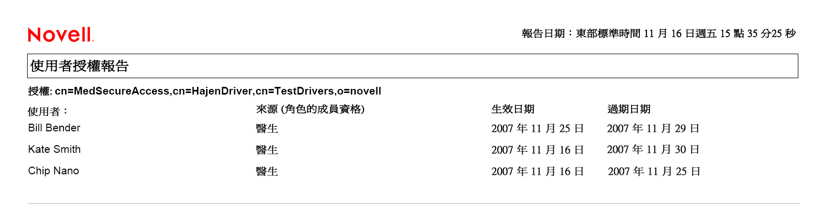 「使用者授權報告」顯示的內容包括: