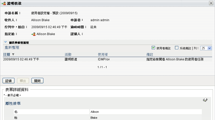 認領了與證明申請相關聯的某項任務之後,您需要檢閱證明表單中顯示的資訊。此外,您需要回答必要的證明問題,以證明資料的正確性,而在某些情況下,您將需要回應一或多個調查問題。針對使用者設定檔證明程序,此表單包含您需要驗證其正確性的使用者屬性資料。針對角色指定、使用者指定以及 SoD 證明程序,此表單包含一份顯示您需要驗證之角色指定、使用者指定或 SoD 資料的報告。