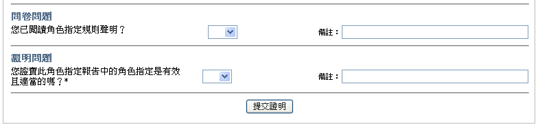 針對所有證明類型,此表單會顯示控制項,以讓您回答必需的證明問題,以及包含在證明程序中的任何其他調查問題: