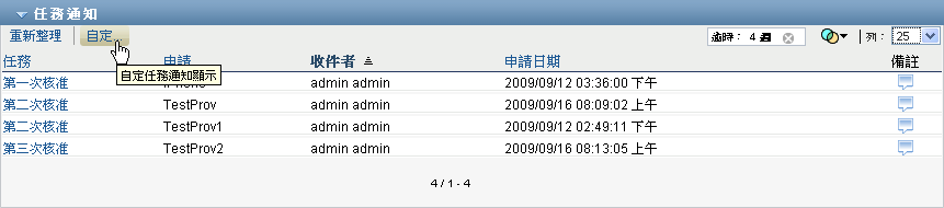 附註:企業使用者無需擁有啟動工作流程之佈建申請定義的目錄瀏覽權限,即可查看自己是收件人的任務。