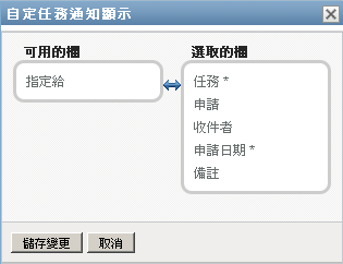 「工作儀表板」頁面的「任務通知」區段可讓您選取和不選某些欄,還可以將任務清單顯示畫面中的欄重新排序。此行為由「自定任務通知顯示」對話方塊內的設定控制。