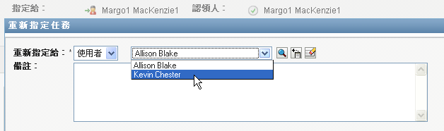 在「」下拉式清單中,選取您想對其重新指定任務的使用者。