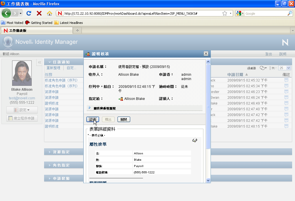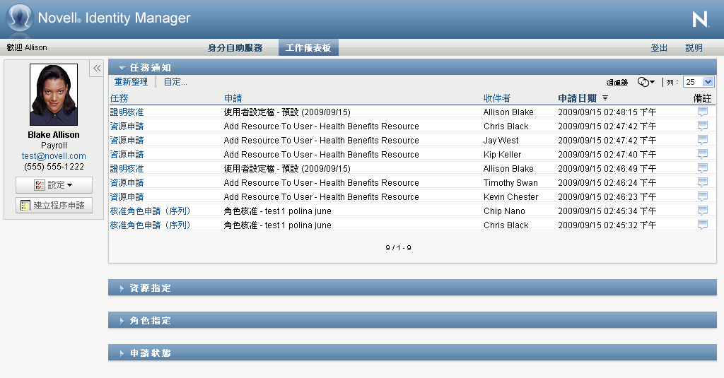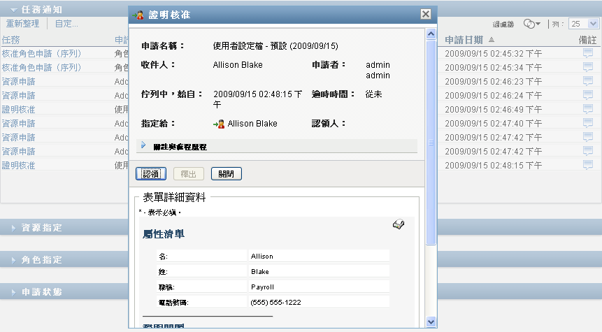 對於資源申請、角色申請和程序申請,此頁面的「」區段會更新為包含「」、「」按鈕以及流程定義中的其他動作按鈕,而某些適當的欄位也變為可以編輯。