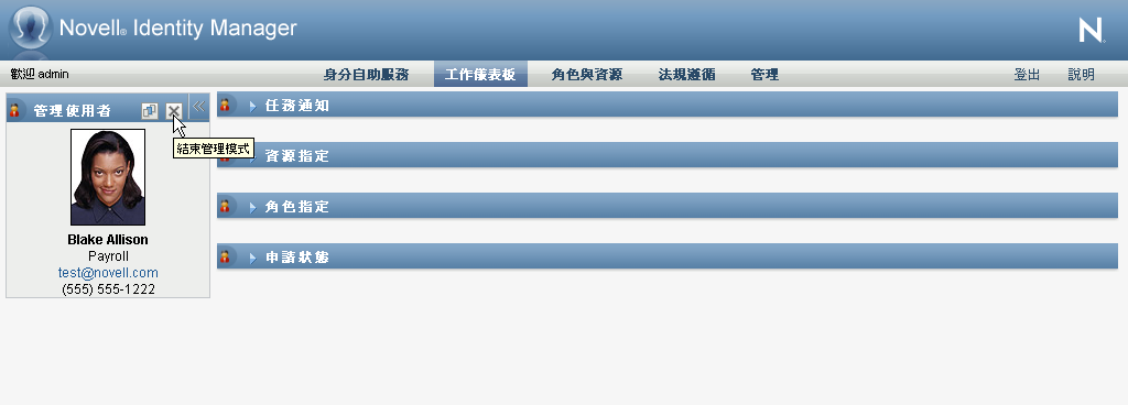 若要結束管理模式,將「工作儀表板」重設為顯示目前登入使用者的資料與存取許可: