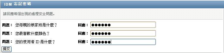 登入 Identity Manager 使用者應用程式後,系統可能會提示您提供其他資訊。這取決於系統管理員為您設定的密碼規則 (如果有的話)。例如: