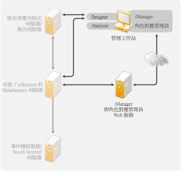 Identity Manager 解決方案的兩個主要管理工具為 Designer 及 iManager,其說明在圖 3-2。Designer 是在規劃及建立 Identity Manager 解決方案期間使用,而 iManager 則用於 Identity Manager 解決方案的每日管理任務。