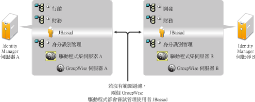 因為「伺服器 A」和「伺服器 B」都會保存「財務部門」容器的複製本,所以這兩個伺服器都會保存「財務部門」容器中的使用者 JBassad。不使用範圍過濾的情況下,「GroupWise 驅動程式 A」與「GroupWise 驅動程式 B」都會同步化 JBassad。