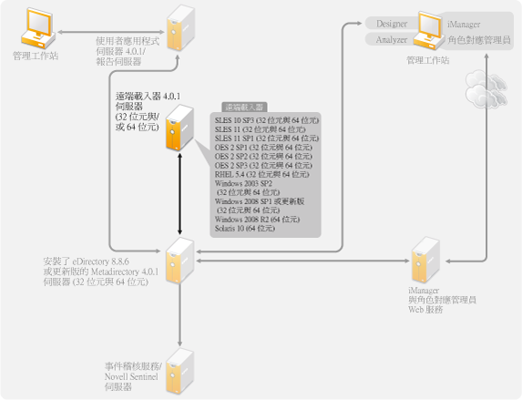 遠端載入器在 32 位元與 64 位元模式下執行。Novell 建議您在安裝 Identity Manager 之前,透過製造商的自動更新機能來套用最新的作業系統修補程式。 |