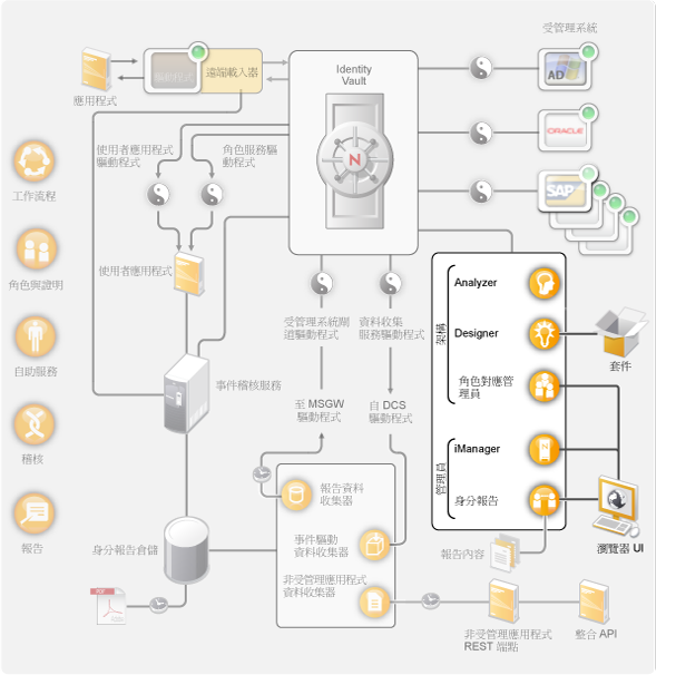 您可以使用 Designer 在離線環境下設計、建立並設定 Identity Manager 系統,然後再將所做的變更部署至線上系統。Designer 還為您提供套件管理功能,可讓您預先設定和自定 Identity Manager 驅動程式規則。建立 Identity Manager 解決方案時則可使用 Analyzer 來分析、清理並準備要同步的資料。