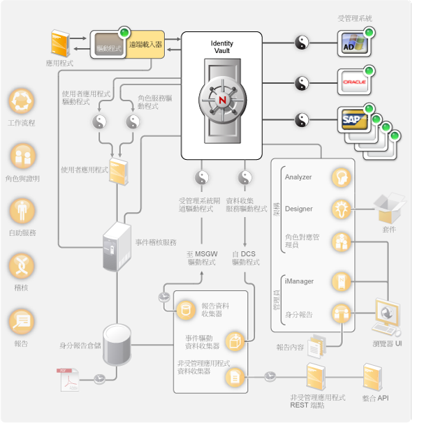 Identity Manager 引擎: 當 Identity Vault 或連接的應用程式中的資料發生變更時,Identity Manager 引擎會負責處理變更。對於 Identity Vault 中發生的事件,引擎會處理變更,並透過驅動程式發出指令給應用程式。對於應用程式中發生的事件,引擎會接收驅動程式送來的變更、處理變更,然後發出指令給 Identity Vault。Identity Manager 引擎也稱為 Metadirectory 引擎。