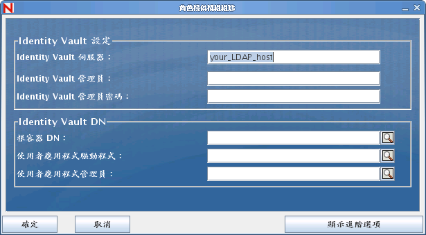 必要。指定 LDAP 管理員的認證。此使用者必須已經存在。「使用者應用程式」會使用此帳戶,來建立 Identity Vault 的管理連線。這個值會根據萬能金鑰進行加密。
