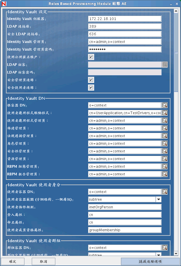 安裝程式會採用「根容器 DN」中的值,並將其套用至下列值: