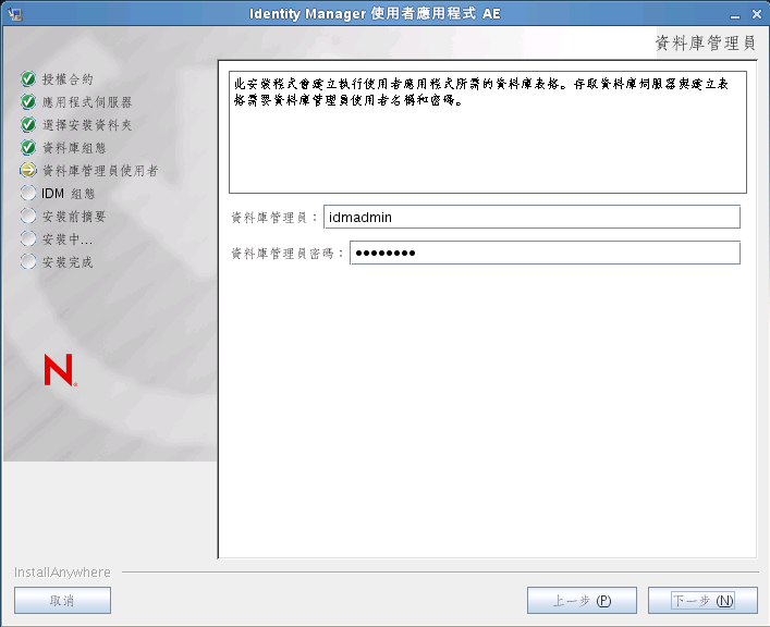 此螢幕已預先填入「資料庫使用者名稱與密碼」頁面上顯示的使用者名稱與密碼。如果之前指定的資料庫使用者不具備足夠許可,因而無法在資料庫伺服器中建立表格,則需要輸入具備必要權限的其他使用者 ID。
