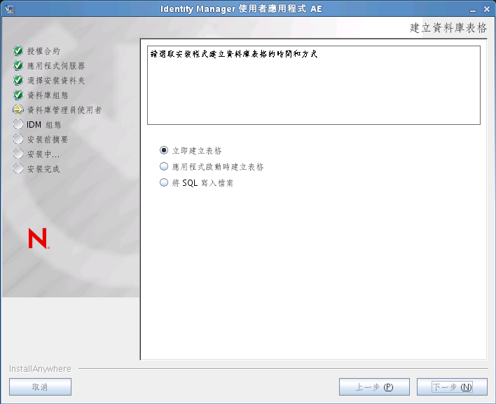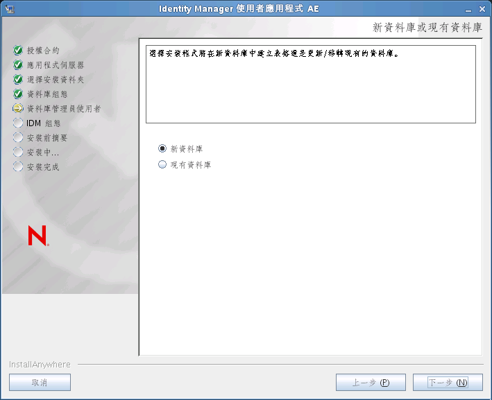 如果要使用的是新資料庫或空資料庫,請選取「」按鈕。如果要使用先前的安裝留下的現有資料庫,請選取「」按鈕。