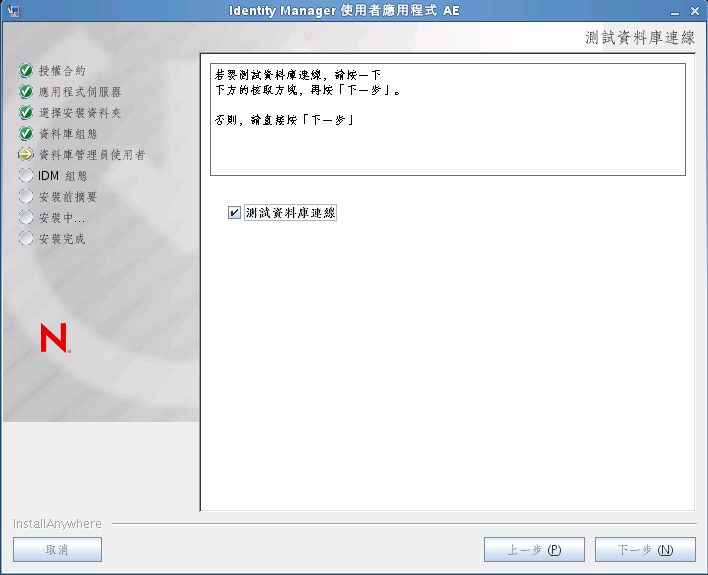 若要確認之前螢幕中提供的資訊是否正確,可以選取「」核取方塊來測試資料庫連接:
