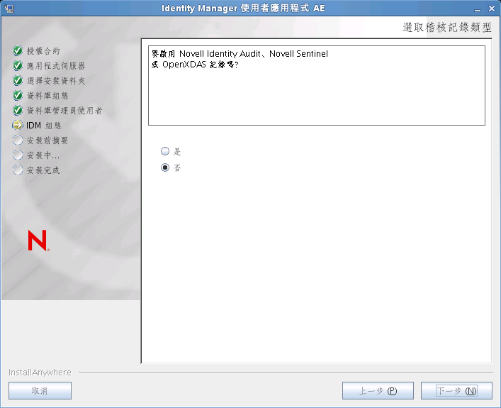 Novell-Custom-Install.log 會存放「使用者應用程式」在安裝期間的組態資訊。
