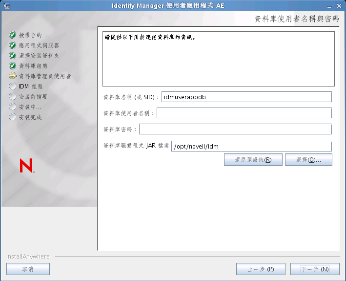 根據下列資訊選擇安裝資料夾並設定資料庫: