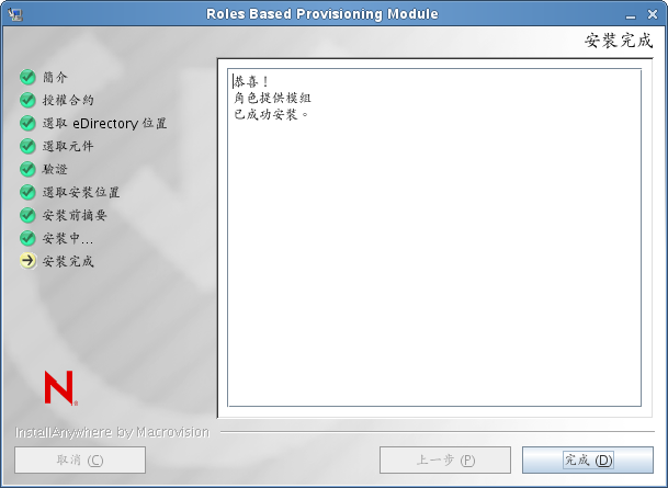 當安裝程序完成時,安裝程式會顯示「安裝完成」螢幕: