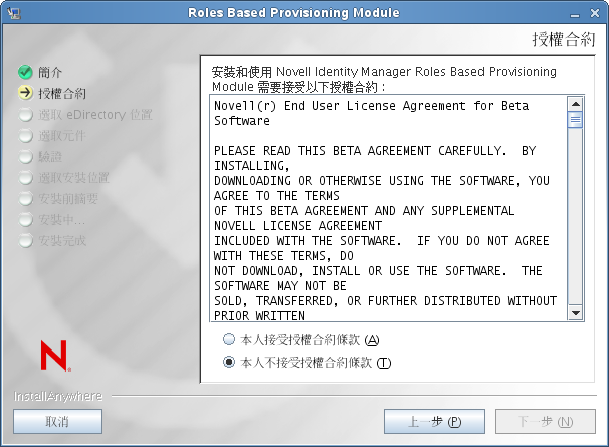 安裝程式會顯示「授權合約」螢幕。