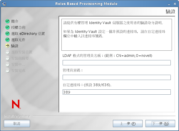 以 LDAP 格式提供管理員名稱並輸入密碼,另外還請指定 LDAP 伺服器的連接埠。