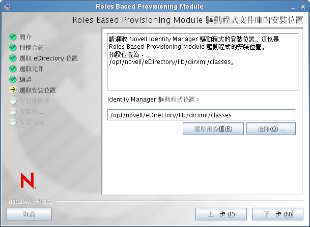 如果使用者身分證明有效,且使用者具備適當的權限,則安裝程式會顯示「Roles Based Provisioning Module 驅動程式文件庫的安裝位置」螢幕: