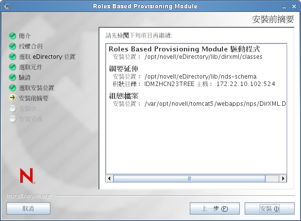 如果摘要資訊正確,請按一下「」,開始執行安裝程序。