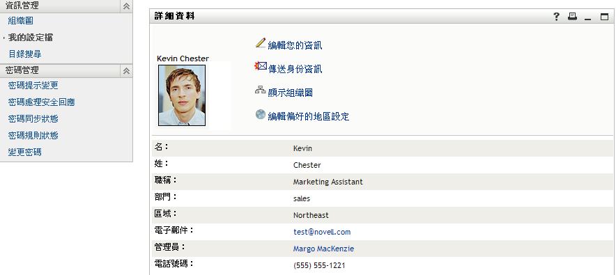 如果想要變更其中一些詳細資料,則可以編輯您的資訊 (但是您有權限編輯的內容是由系統管理員所決定)。例如,假設 Kevin Chester 按一下「」。若管理員已給予權限,他就會看到一個可編輯「設定檔」資訊的頁面: