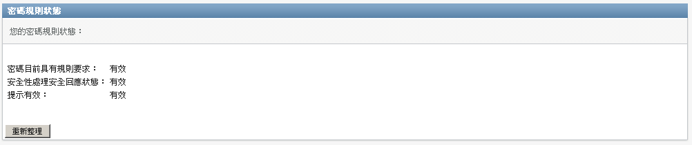 1. 在「身分自助服務」標籤上,按一下功能表 (位於「密碼管理」下) 中的「密碼規則狀態」。「密碼規則狀態」頁面隨即顯示。例如: