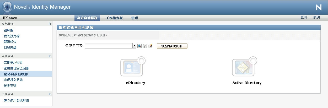 在「身分自助服務」標籤上,按一下功能表 (位於「密碼管理」下) 中的「密碼同步化狀態」。「密碼同步化狀態」頁面隨即顯示。全彩圖示表示應用程式已進行密碼同步化。灰色圖示表示應用程式尚未同步化。例如: