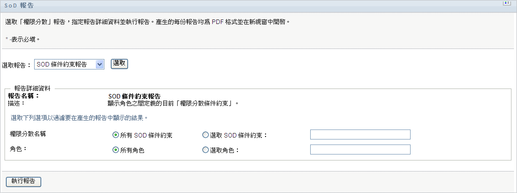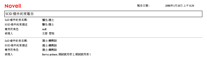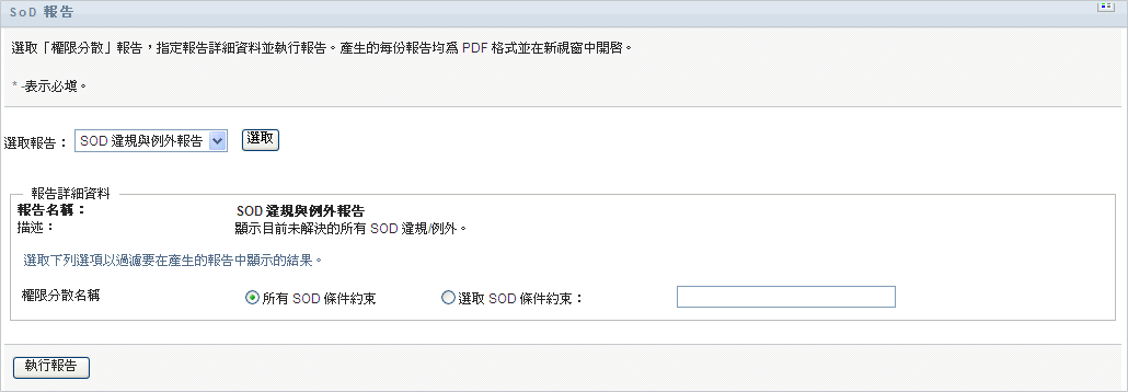 「SoD 條件約束報告」顯示的內容包括: