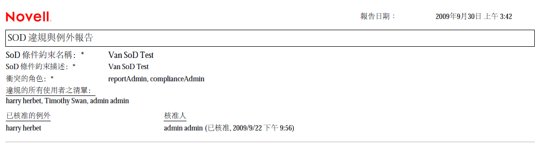 「SoD 違規與例外報告」顯示的內容包括: