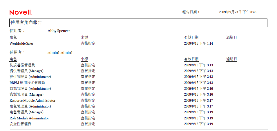 「使用者角色報告」顯示的內容包括: