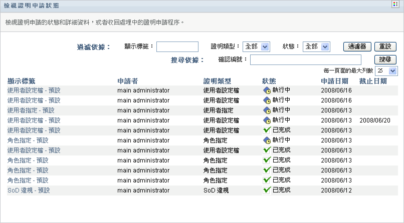 「」動作會顯示所有證明申請,包含啟始化中、執行中、已完成或發生錯誤的這些申請。