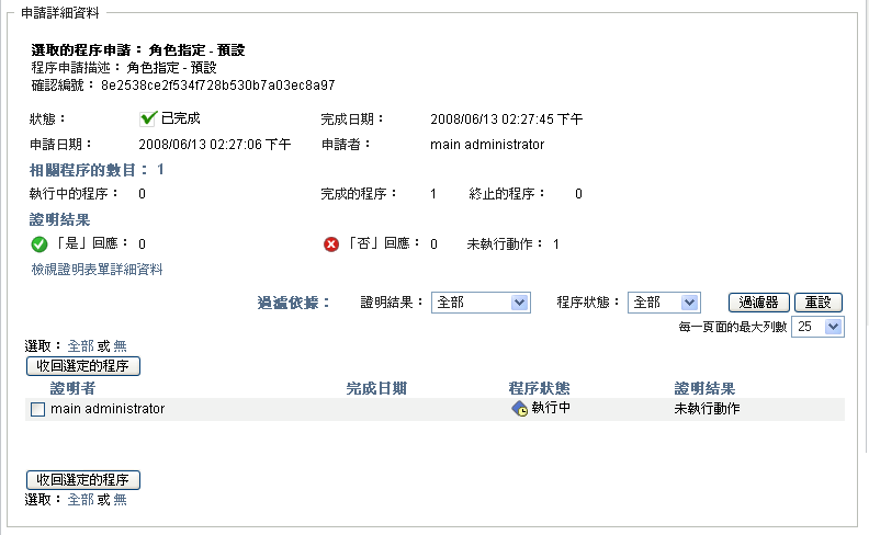 「」動作可讓您查看您的證明申請狀態。此外,還能讓您選擇查看因應申請而啟動的各個工作流程程序的詳細狀態,以及選擇性地收回一或多個執行中的程序。
