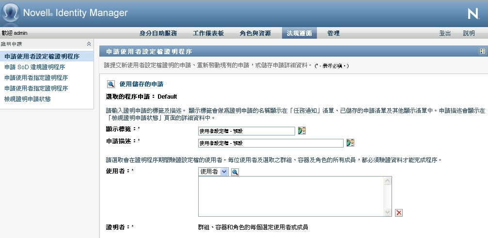 依預設,「法規遵循」索引標籤會顯示「申請使用者設定檔證明程序」頁面。