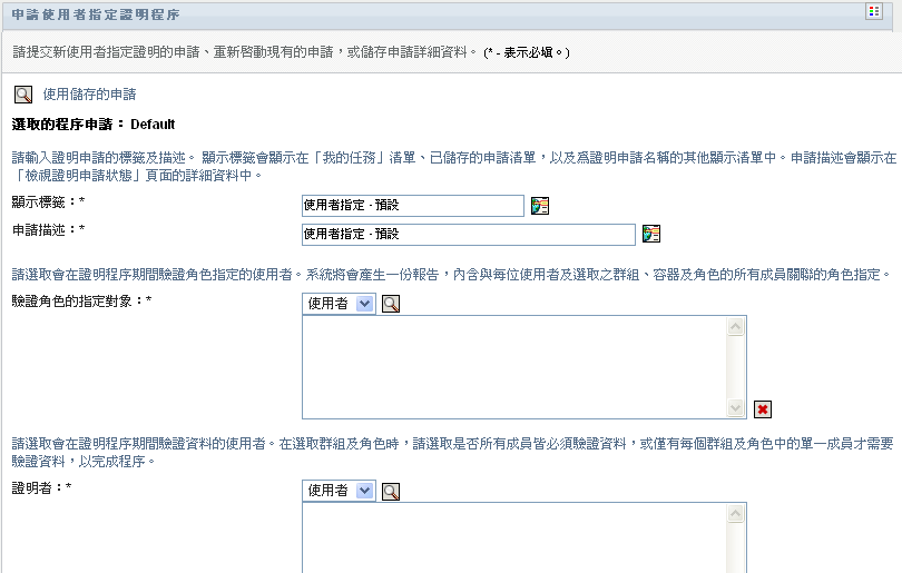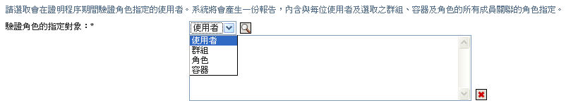 您必須選取至少一個使用者、群組、角色或容器以啟動證明程序。不過,您不需要選取一個使用者、群組、角色或容器以儲存申請。