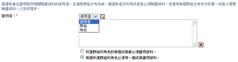 對於群組及角色證明者,請選取下列其中一個按鈕以指定是否所有成員都必須證明資料,或每個群組及角色中只需有一個成員證明資料: